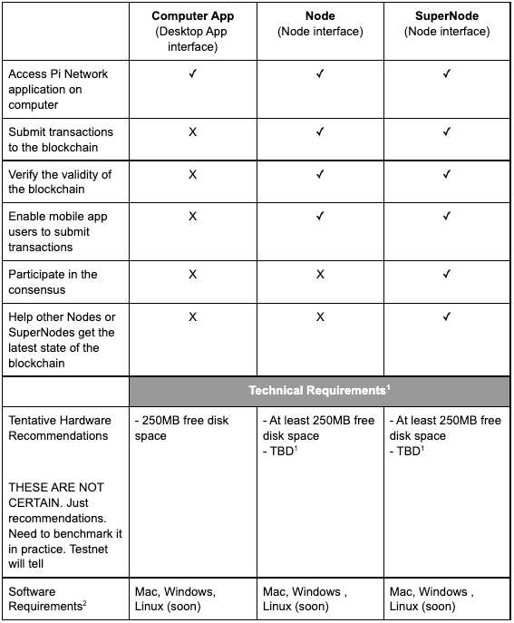 See the table below for a summary of the three levels of participation in Pi Node software, and the hardware and software requirements for computers at each level of participation.