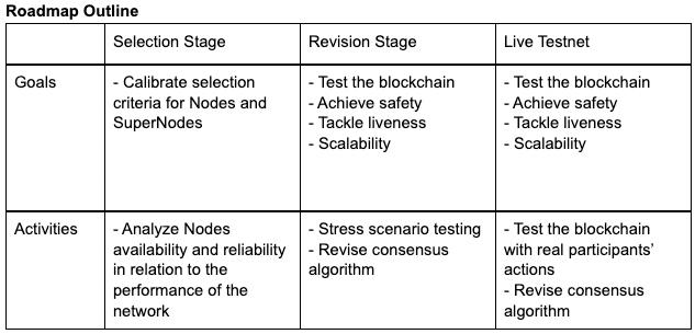 Live Testnet will be the stage when different types of nodes actively perform the responsibilities defined in the tables above (See Section Levels of Node Participation). Nodes will be able to submit testing transactions that get recorded on the distributed ledger by nodes through the consensus algorithm. The purpose is still to test the performance of the network, but with real data from security circles generated by mobile miners and real activities of participants of the network. It also contains an iterative process of testing, data analysis, debugging, revising and innovating to achieve safety and tackle liveness and scalability.